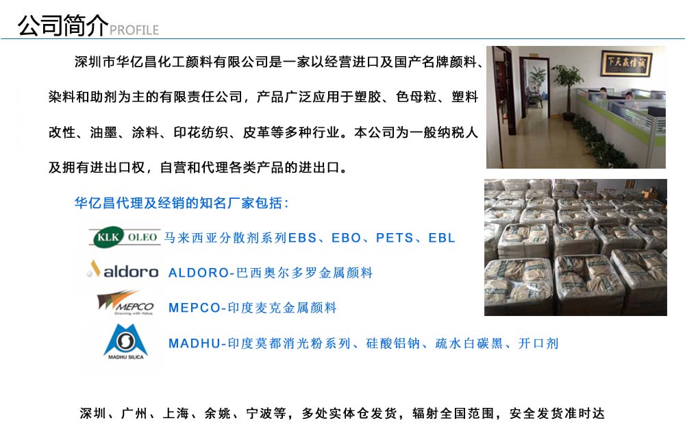 EBS-SP(乙撑双硬脂酸酰胺)在色母粒生产中,EBS-SP兼作颜料分散剂,并有抗静电、抗冲击的作用。配入EBS-SP后,可 将颜料分散成细微、稳定、均匀的颗料,有效地防止颜料在后面加工过程中凝聚,提高成品的色泽均匀度,是目前最理想的颜料 分散剂(0.5-1%的配合量即可)。