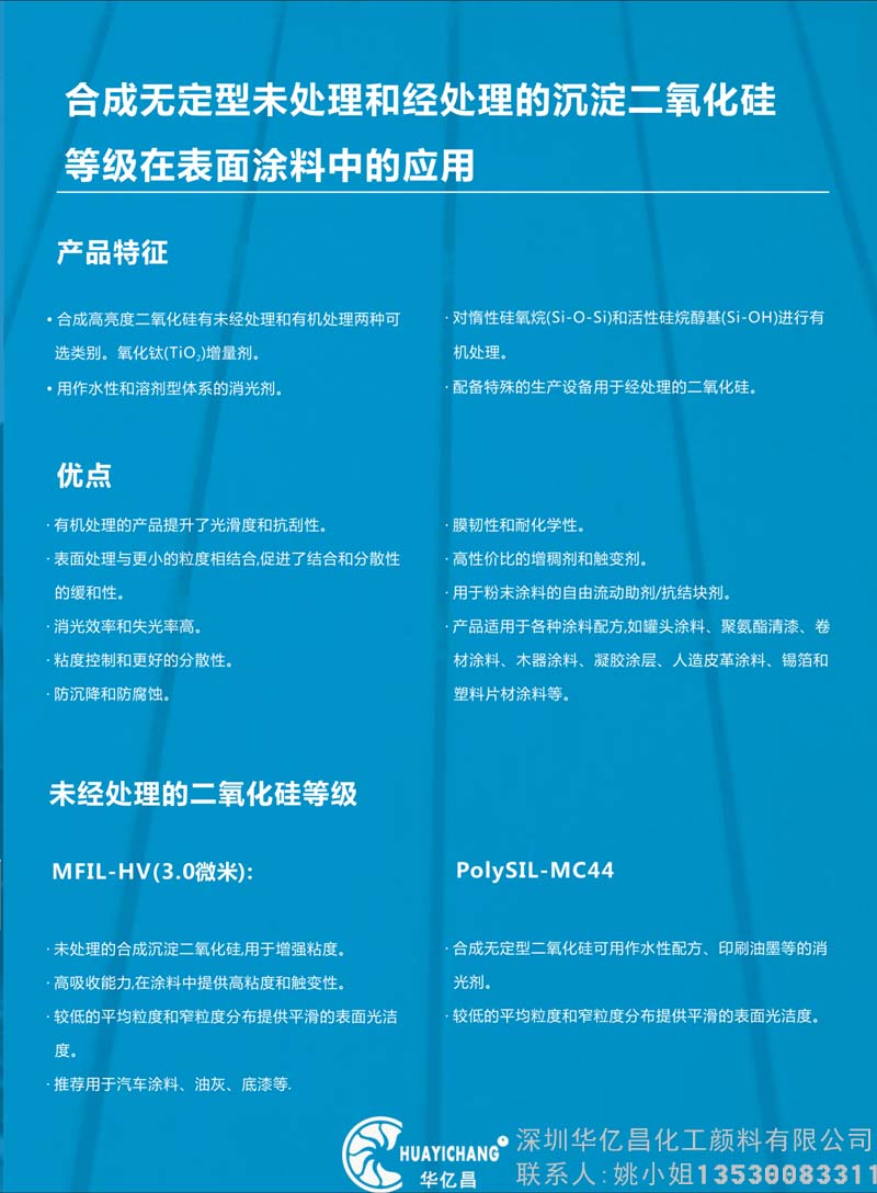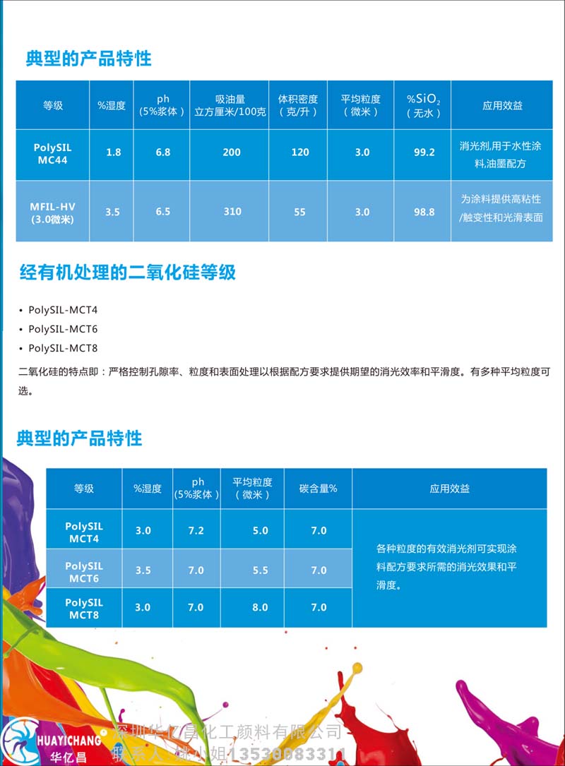 二氧化硅的特点即:严格控制孔隙率、粒度和表面处理以根据配方要求提供期望的消光效率和平滑度,有多种平均粒度可选。